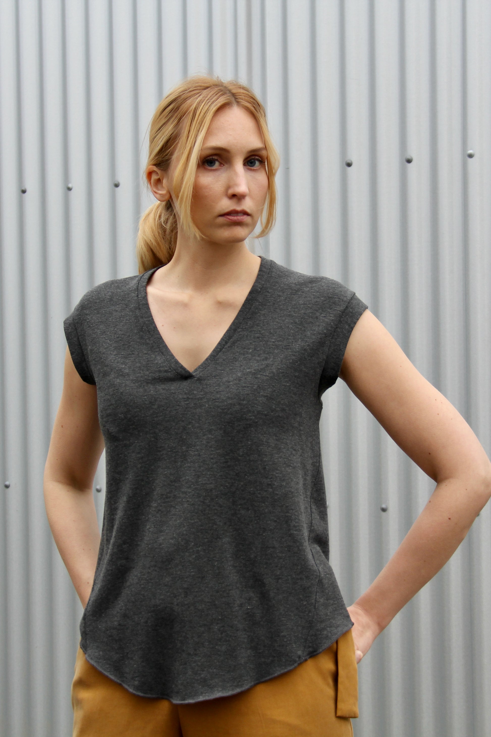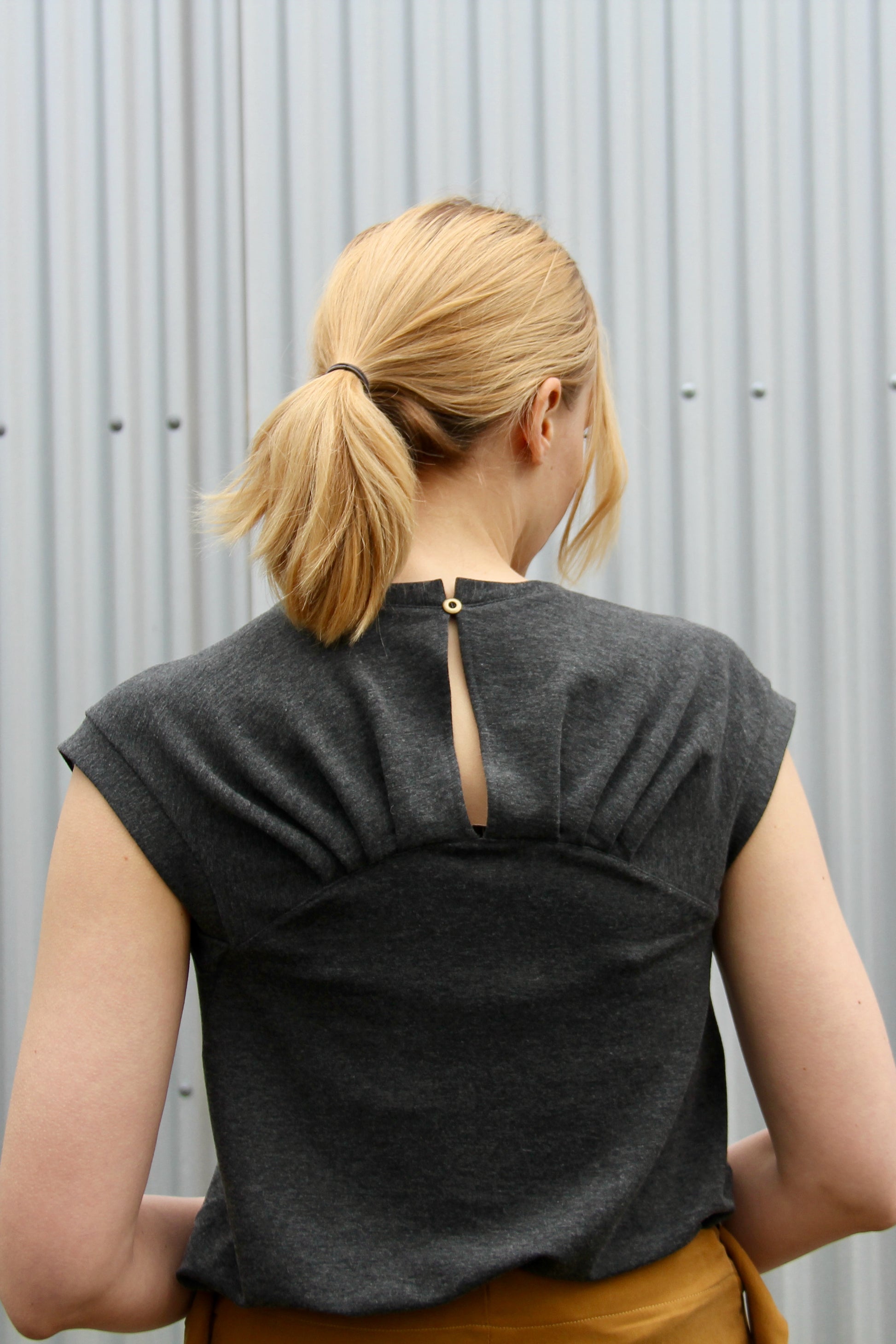 Þessi toppur úr prjónaefni er með fellingu í baki, V-hálsmáli að framan og klauf að aftan sem er lokað með krók, ásamt stuttum ermum. Auðvelt að fara í hann.