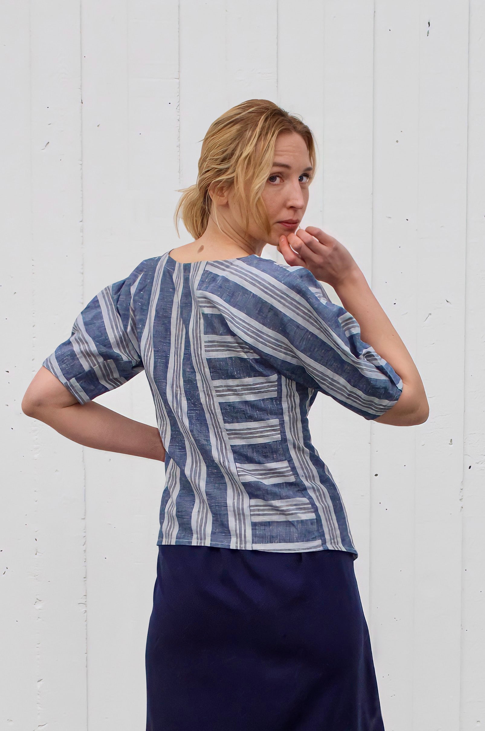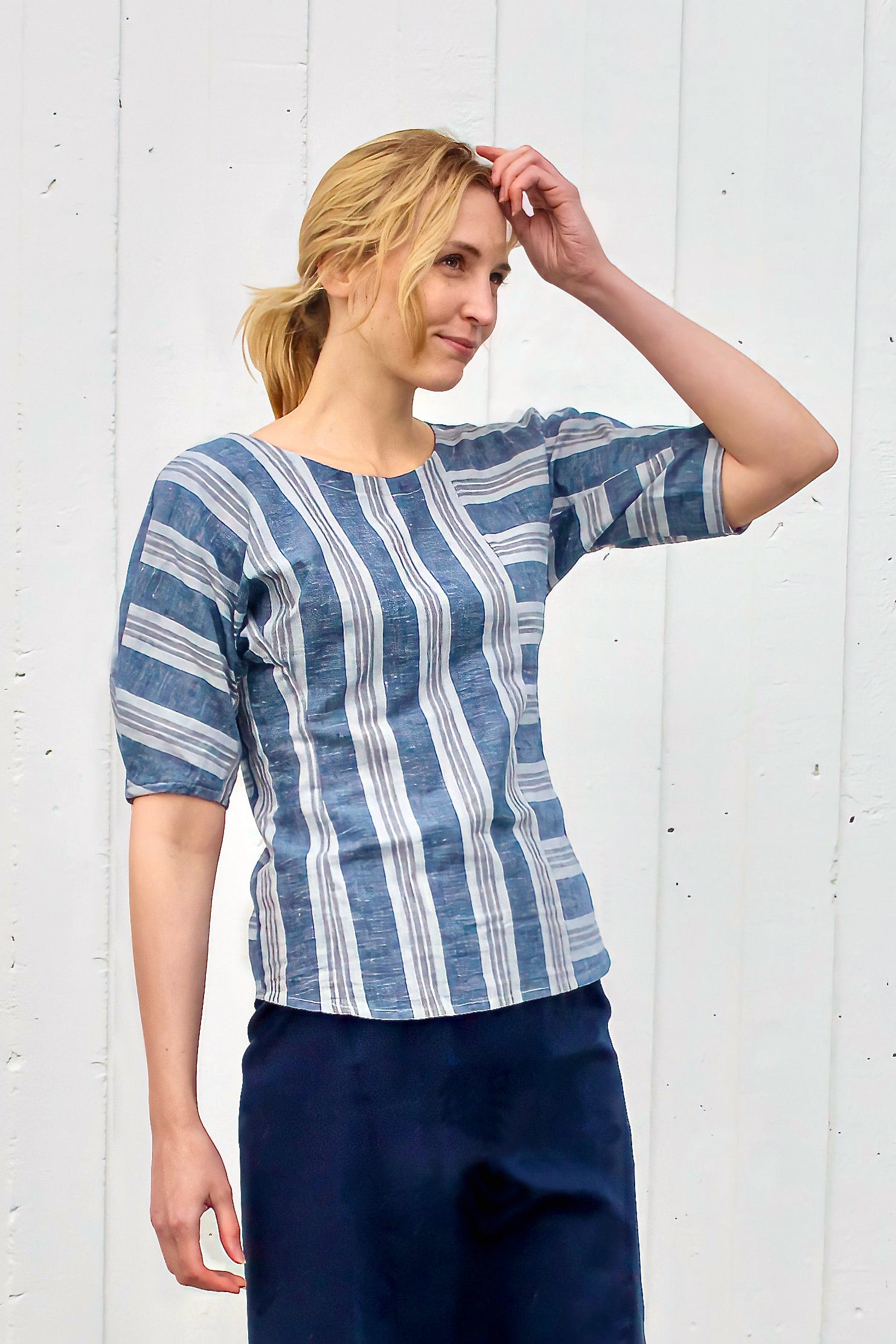 Juxtaposed panels of striped hemp/organic cotton fabric, this top has voluminous sleeves pleated at the opening, a round neckline and a slight hourglass shape complimented by a side gusset. No closure, pulls on.